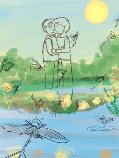 'The first imagery that came to mind as I started reading the poem ‘Mayfly’ was spring time, a pond, mayflies and sunlight. Upon second reading, I felt like I definitely needed to visually showcase the romantic air of the poem that surfaces towards the latter half of the poem. Overall, I felt encouraged to highlight the parallel thoughts reflected in the lines alongside the short lived nature of the mayflies. To me, the poem was about the celebration of nature, springtime, love, and life. Therefore, I wanted that to be depicted in the artwork. As I have shown the mayflies to be translucent due to their short-lived nature, I imagined the same short-lived nature to be mirrored by the human characters who seem to be in love. Lastly, after reading the poem and responding to it visually, I happened to introspect and think about how universally, everyone should acknowledge that life is too short to not treat everyone with love and appreciation.' - Deandra D'Cunha