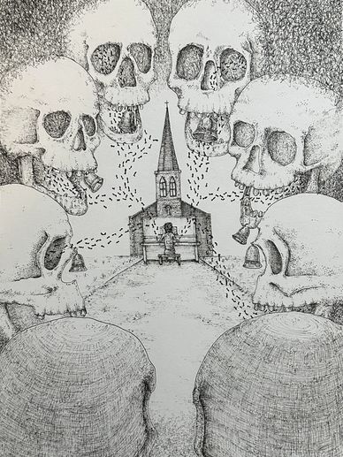'When I first read MacNeice's 'Sunday Morning', the imagery of the scene was calm and lighthearted, like spectating a simulation of town dwellers going by their usual routines. As the poem goes on, the tranquil pacing seemingly sped up, as if time was suddenly going by so rapidly you lost grip of what's happening already. The final stanza portrayed an eerie setting moving skulls in silence, where I pictured them engulfing reality slowly but surely. There were a few aspects I wanted to capture in the drawing: the unawareness of time passing; the helplessness of the undeniable fact of time-passing; and the appreciation of the present. The person playing the piano has no idea of the inevitable loss of time, as the notes they played continue to 'feed' into the skulls. However, despite the overwhelming truth, it is also comforting in a way to see the piano player play on, enjoying and living in the moment.' - Cyrus Ho