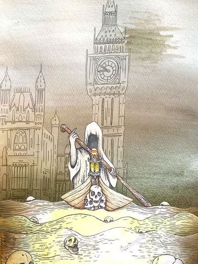 'The underworld of Greek mythology serves as the basis for MacNeice's 'Charon.' Since obols were an ancient Greek form of money used to pay the Charon, that name is utilised. You would be granted entry into the underworld in exchange. This poem depicts the events that take place in London on the voyage to the underworld. I intended for this drawing to convey the melancholy, anxiety, and ambiguity surrounding death. I capitalise on the eerie and ghostly image of Charon by utilising watercolour as my medium. I wanted to convey the atmosphere of the poem into my illustration, by using dark, despondent colours to relate to death and the Greek underworld. The primary colours I used were green, blue, yellow, and brown. Still, I wanted the sea to be sufficiently light to photograph Big Ben. In reference to the phrase 'eternity gave itself airs in revolving light,' In the center of London is the River Thames. It was known for bodies and skeletons washing up on the shore, earning it the nickname 'River of Bones.' This is related to the skulls that are scattered throughout the image; additionally, the skulls stand for the destruction that is predicted. This is demonstrated in the poem through the quote 'rumours of war,' which is related to a biblical illusion and alludes to Matthew 24:6-7 and other passages. The skulls I've used are related to Jesus' prophecy of devastation, starvation, and pestilence found in Matthew 24, which is also commonly recognised as his prophecy that the Jerusalem temple will be destroyed. I intentionally created a murky, dark, and sunless water to capture the atmosphere of the poem. I wanted to point out that Charon is sailing through London to pick up his passengers, since Big Ben is located on the Thames River. The 'dissolving map' is indicated by the background being left uncluttered, which illustrates the sense of travelling into the unknown.' - Eve Whitfield
