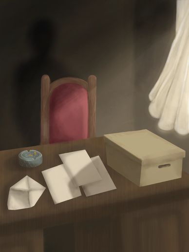 'After reading the poem 'The Suicide,' I had a sudden and intense impulse to make this artwork. I tried to capture the scene's atmosphere as well as I could. I was able to create a soft, gloomy atmosphere with the aid of digital art. The artwork is made up of numerous layers, each of which I added a layer of colour or shade to gradually construct a scene. Thorough research was the most crucial step in the creation process. I began my journey by learning about the emotions that are connected to suicide and the death of a loved one. Our minds are disturbed by emptiness. After losing someone, we must restructure our lives and come to terms with upcoming changes. To visualise these feelings, I designed a scene that is gloomy and full of emptiness, complete with a pile of old documents, unfinished business, and letters that will never be replied to. An ashtray filled to the brim with ash and cigarette butts represents the writer's recent arrival. When we leave the desk, it seems as disorganised as the rest of the world. After we leave this world, our loved ones' world is in disarray, but the soft light coming through the window keeps everything serenely lit. The somber color scheme accentuates the ominous mood, while the gentle light filtering through the curtain inspires optimism for a brighter tomorrow. That demonstrates that, in general, nothing remains when we are gone. At last, a vacant chair, this place no longer belongs to us. All we can do is watch this show called Life. Simply observe it as a shadow of our past. Knowing what the loss is in this poetry can help you grasp it. How to handle the suffering that comes with change. It is not something we can alter now. Most of the time, change is necessary and natural. The consistency of the past will no longer exist. The only way to deal with it is to accept our current state.' - Agata Lis